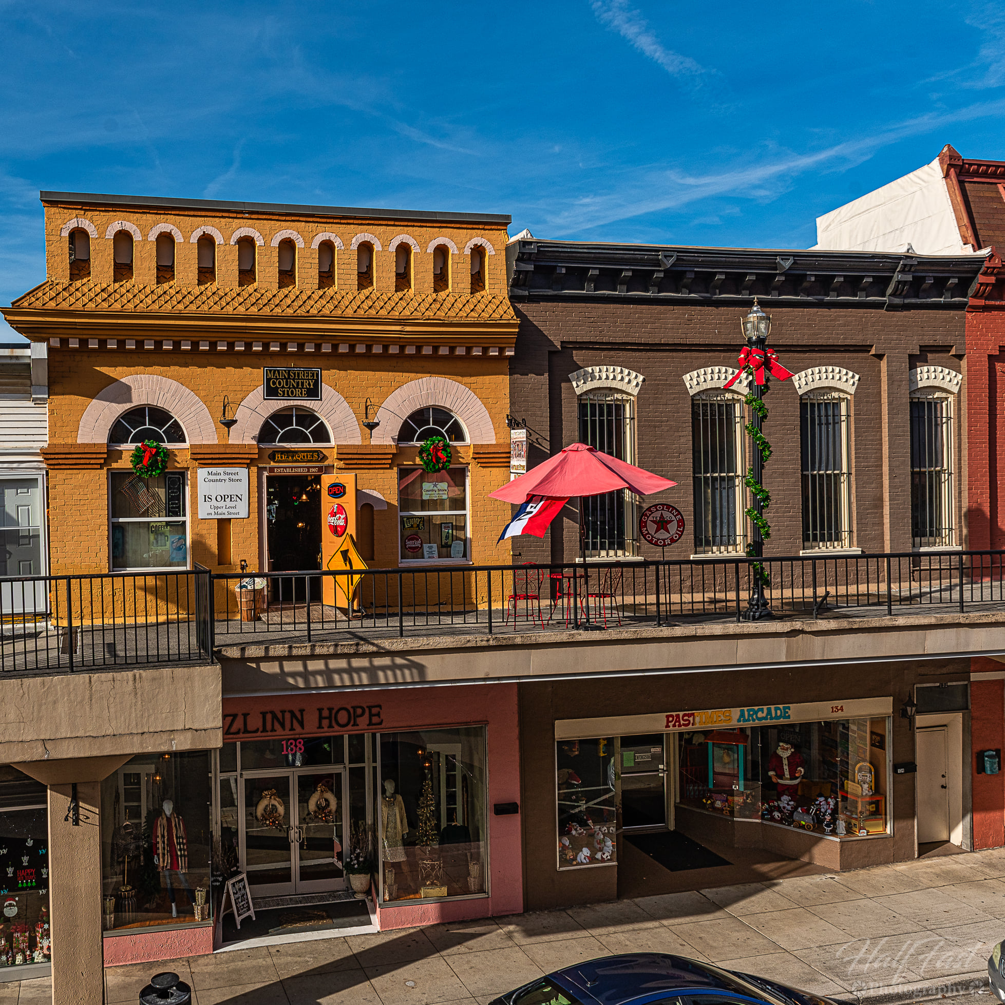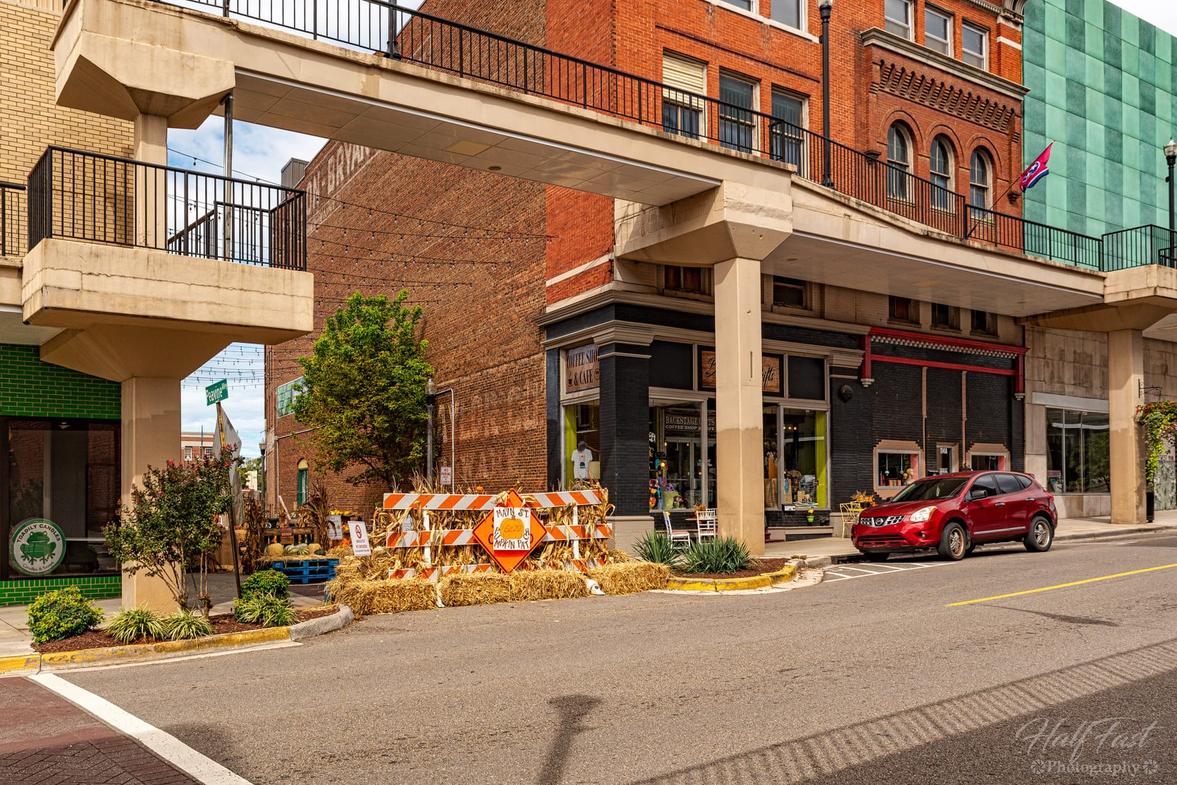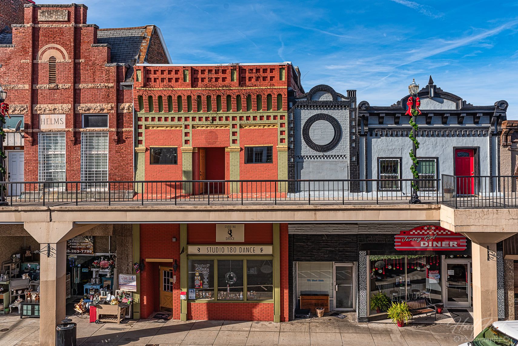 Morristown’s Main Street area, with an approximate area of a square mile, grew up around a waterway known as Turkey Creek and the intersection of two railroad lines. In 1962, the creek flooded, nearly wiping out the downtown commercial district. At the same time, a suburban shopping mall on the city’s west side was draining the vitality of the historic downtown district, and the city developed a plan to modernize Main Street by creating an “overhead sidewalk” that would turn the second floor of the existing buildings into a new “street” while serving as a canopy for the sidewalks below. Building owners spent nearly $2 million upgrading their properties and linking them to the ramp, while the government contributed over $5 million to build the elevated walkways and to enlarge and reroute the underground channel carrying Turkey Creek.